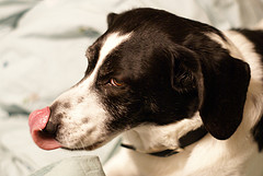 Calming signals are behaviors that dogs naturally exhibit when they are feeling stressed and are trying to diffuse a situation. Norwegian dog trainer and author Turid Rugaas coined the phrase “calming signals” and she has identified approximately thirty behaviors as such. These behaviors include: licking the lips, showing the whites of the eye, sniffing the ground, turning away (either just the head, or the entire body), lifting a front paw, yawning, full-body shaking (as if the dog is trying to dry herself off after a bath), and panting. These are documented in her excellent book, On Talking Terms with Dogs: Calming Signals.
