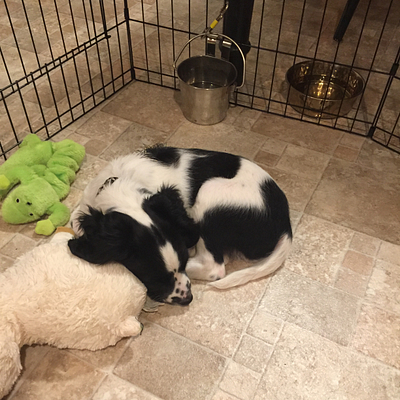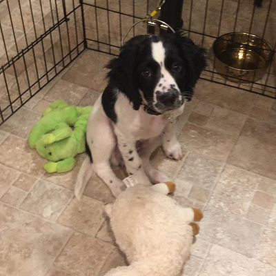 - placing the puppy in a pen with toys inside (again, we recommend it includes at least one chew)