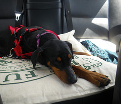 This dog is very relaxed on his mat and is safely restrained in the car by a seatbelt harness. (Photo Credit: Jojof – Flickr)
